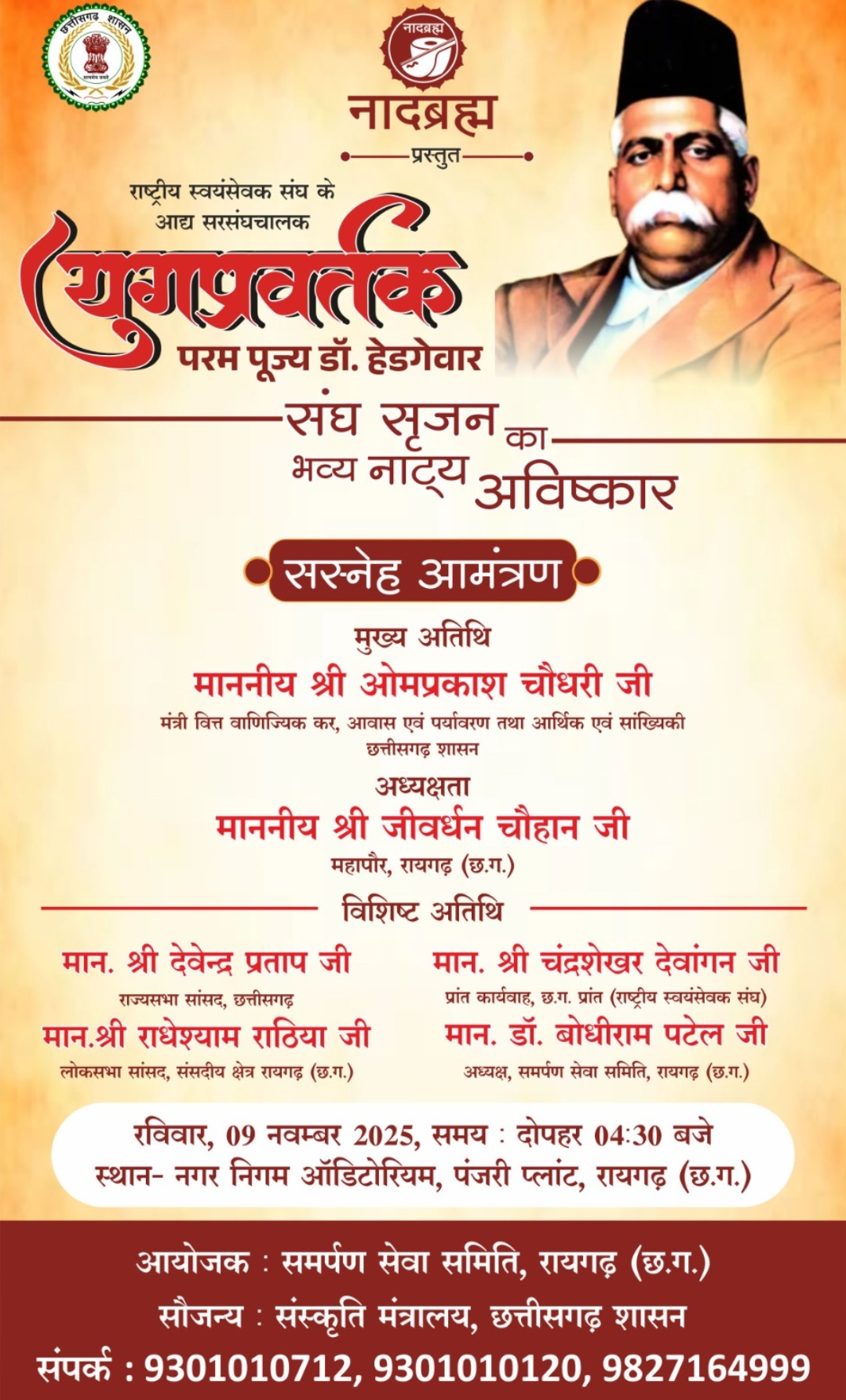 रायगढ़। संघ अपना शताब्दी वर्ष मना रहा है। इस शुभ अवसर पर संघ के संस्थापक डॉक्टर केशवराव बलिराम हेडगेवार युग परिवर्तक की जीवनी का नाट्य मंचन रूप में समाज के सामने प्रस्तुतिकरण होगा । डॉ केशवराव बलिराम हेडगेवार जी ने संघ की स्थापना 1925 विजयादशमी के शुभ दिन पर की थी, जिसका परिणाम आज का समाज संगठन के रूप में है।