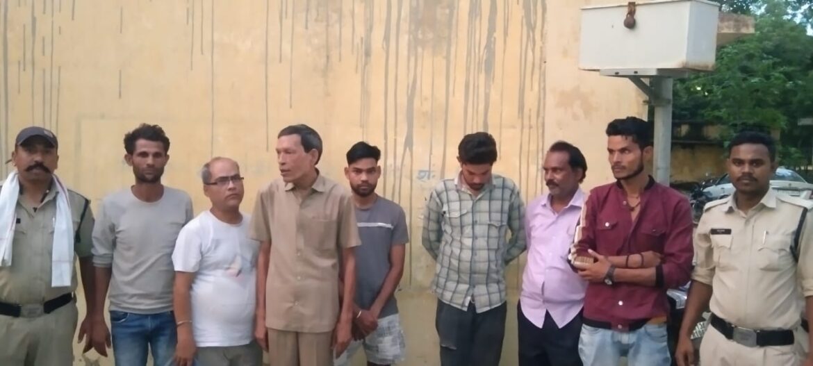 मिली जानकारी के अनुसार बुधवार को दोपहर थाना प्रभारी कोतवाली निरीक्षक शनिप रात्रे को मुखबिर द्वारा संजय काम्प्लेक्स पर कुछ व्यक्तियों के 52 पत्ती ताश से जुआ खेलने की सूचना मिली । थाना प्रभारी ने थाना से जुआ रेड के लिये स्टाफ रवाना किया गया। कोतवाली पुलिस की टीम ने मौके पर ताश पत्ती से जुआ खेल रहे 06 जुआरी उमेश केशरी पिता दिलीप केशरी उम्र 48 वर्ष निवासी सोनकरपारा , राज ठाकुर पिता श्री गुलाब सिंह ठाकुर उम्र 24 वर्ष निवासी रेल्वे बंगलापारा , मुन्ना अग्रवाल पिता मांगेराम अग्रवाल उम्र 60 वर्ष निवासी कालीबाडी दरोगापारा , सलमान अली पिता नाशिर अली उम्र 30 वर्ष निवासी राजीव गांधी नगर मिट्ठुमुडा , श्रीकांत साहू पिता मनोहर साहू उम्र 26 वर्ष निवासी फटहामुडा और मनोज कुमार पिता विजय कुमार उम्र 51 वर्ष निवासी स्टेट बैंक के पास कोतरारोड थाना कोतवाली रायगढ़ को पकड़ा गया। जिनके फड़ और पास से जुमला रकम 7,920 रुपए एवं 52 पत्ती ताश की जप्ती की गई है । आरोपियों पर धारा 3(2) छत्तीसगढ जुआ प्रतिषेध अधिनियम 2022 के तहत कार्यवाही किया गया है । साथ ही आरोपियों पर पृथक से धारा 151 की कार्यवाही की गई है । जुआ रेड कार्यवाही में प्रधान आरक्षक विक्रम चौरसिया, आरक्षक जगमोहन लाल ओग्रे, संदीप मिश्रा और उत्तम सारथी शामिल थे ।